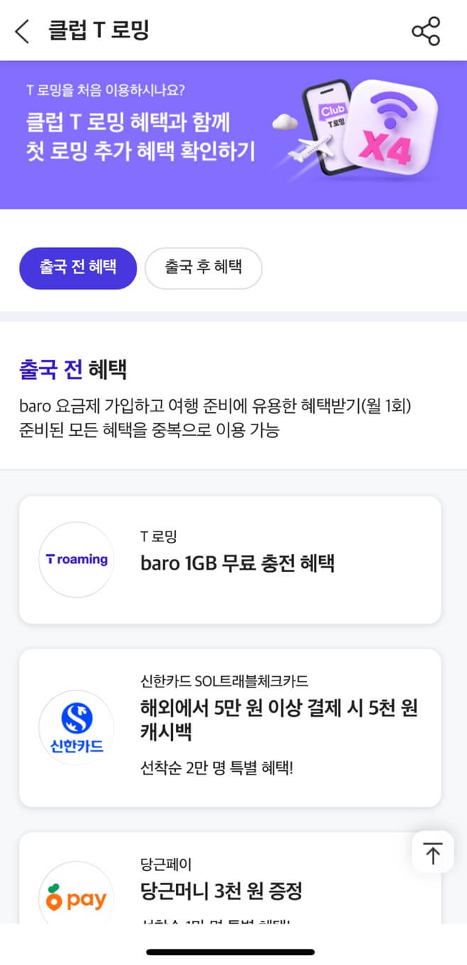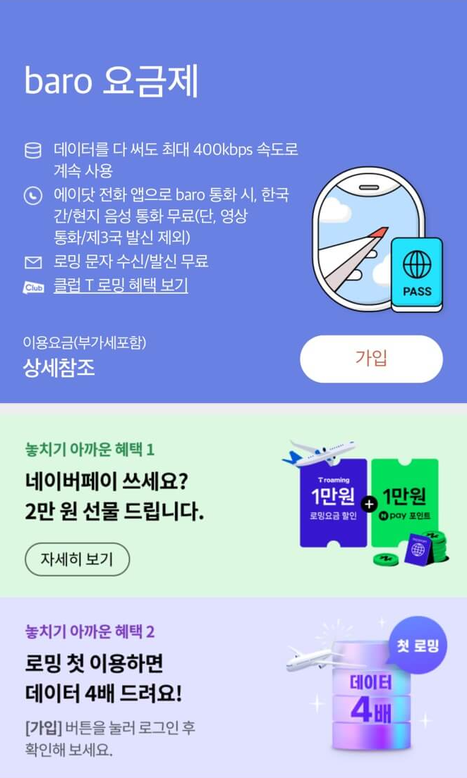 - 로밍 데이터 혜택: baro 요금제 무료/할인, 자동 데이터 충전