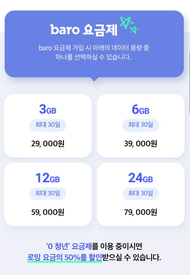 ※ baro 요금제 데이터 1GB 충전은 월 1회 한정이므로, 여행 일정에 맞춰 신청하세요.
